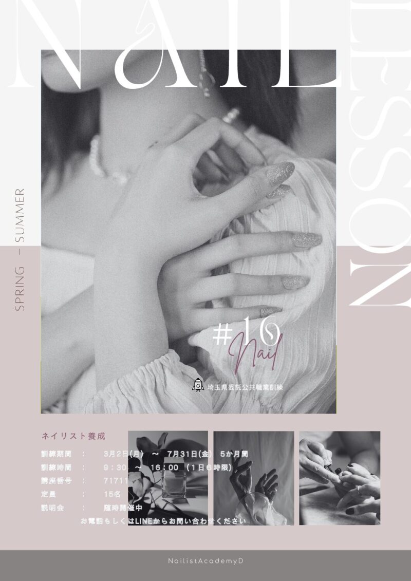 職業訓練 LINE コピー 2026.01.022022.09.25 埼玉県委託公共職業訓練 募集期間 令和8年 1/14(水)~ 1/30(金) 訓練期間 3/2(月)~7/31(金) 5か月間 講座名 ネイリスト養成 講座番号 71711 定員 15名 選考日 2/5(木)面接
